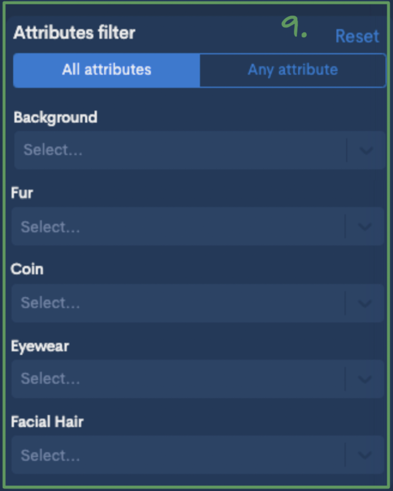 The first mode is the "All attributes" mode. This filter will display every NFTS that match the combination of ALL attributes you selected (see below).